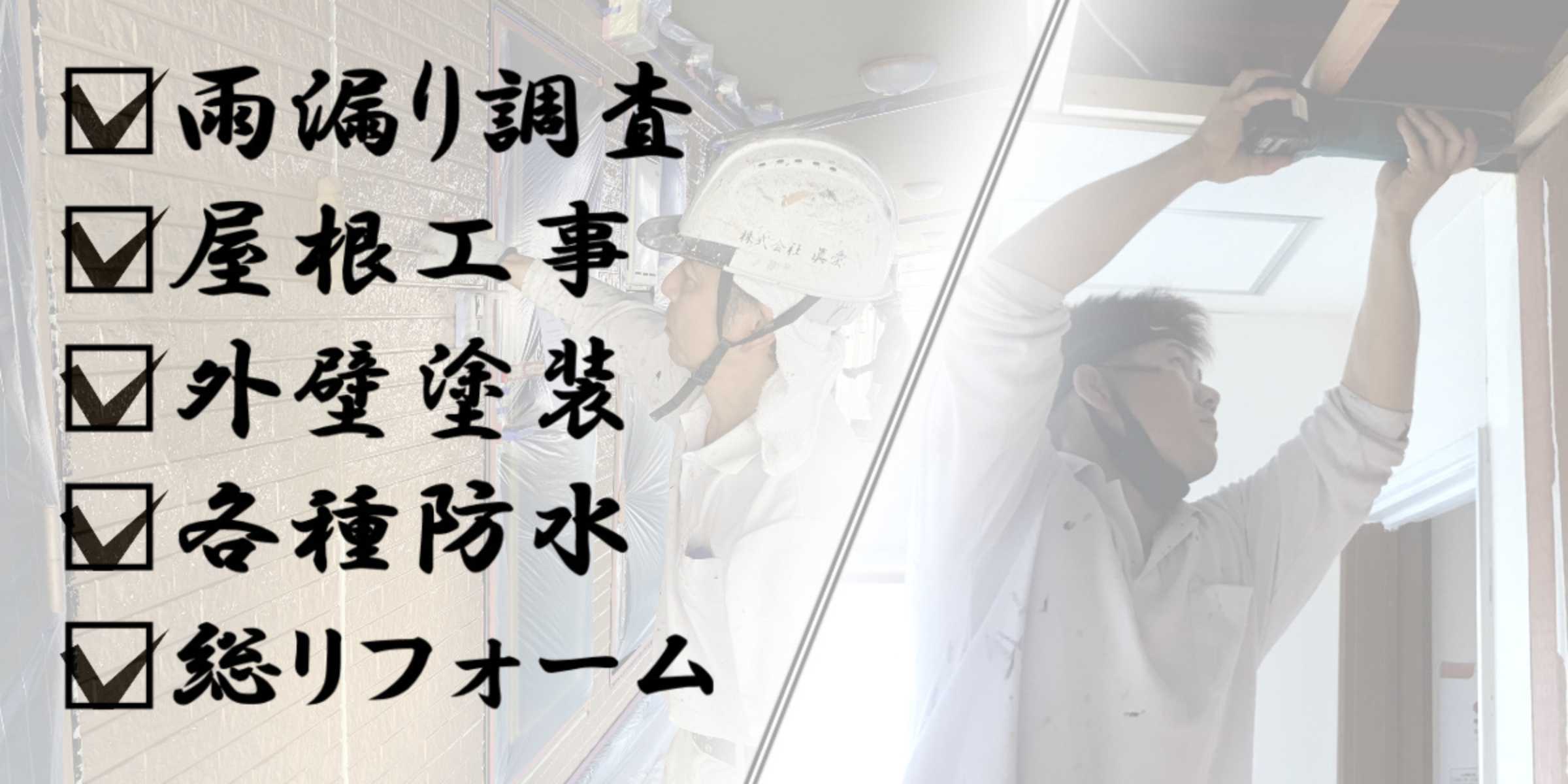 まずはじめに弊社は改修工事の主軸として雨漏り修繕、改築、防水塗装に力を入れております。